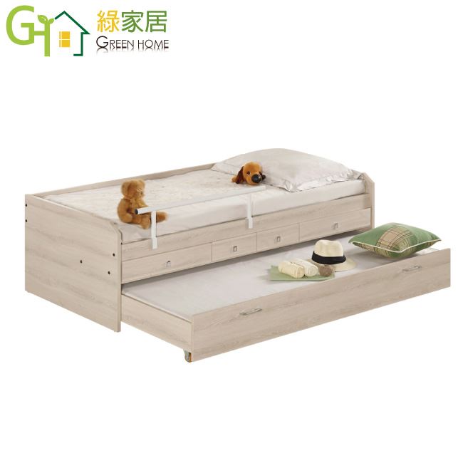 商品 介紹 | 【綠家居】羅麗 四抽3.3尺單人子母床台組合(二色可選+不含床墊) 二色可選+現代簡約風格+安心材質製造,整體採用防蛀木心板+母床為四分木床板+子床為六分木床板+防潮耐磨腳座+五金滑軌結構+子床含便利滑輪設置等安心材質製造,產品外層採用防潮耐磨噴漆處理搭配採用子床可掀式床板+內含收納層格+四抽屜等收納空間設計,全由專人配送到家,專業安心服務,替你省下更多時間! 【商品特色】 二色可選+現代簡約風格+安心材質製造,使用放心+搭配居家更便利 子床+母床組合便利設計,增加居家實用便利性 採用防蛀木心板+母床為四分木床板+子床為六分木床板+防潮耐磨腳座+五金滑軌結構+子床含便利滑輪設置等安心材質製造 產品外層採用防潮耐磨噴漆處理 搭配採用子床可掀式床板+內含收納層格+四抽屜等收納空間設計 此商品不需要DIY組立,此商品為組立後之成品 品質保證、專業設計、貼心服務 |