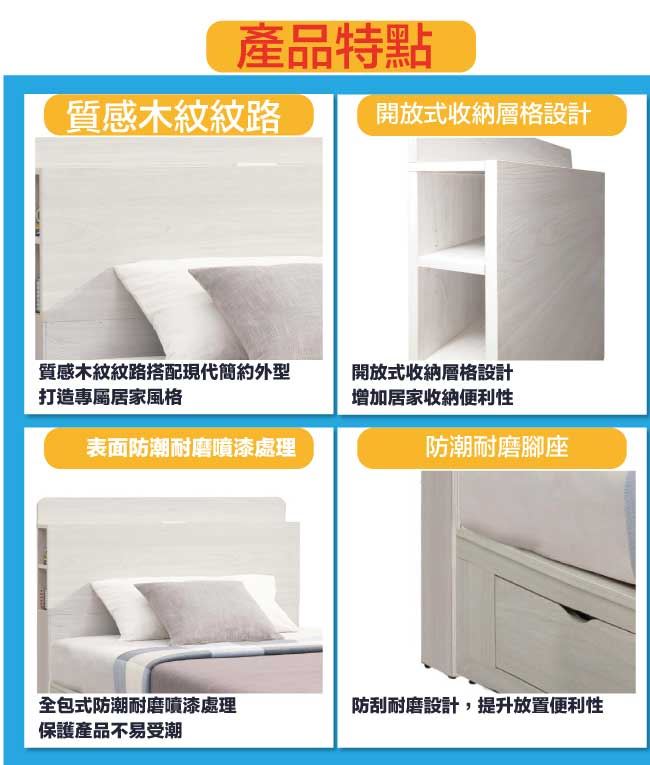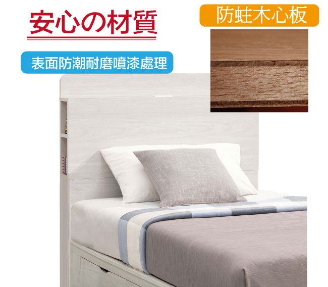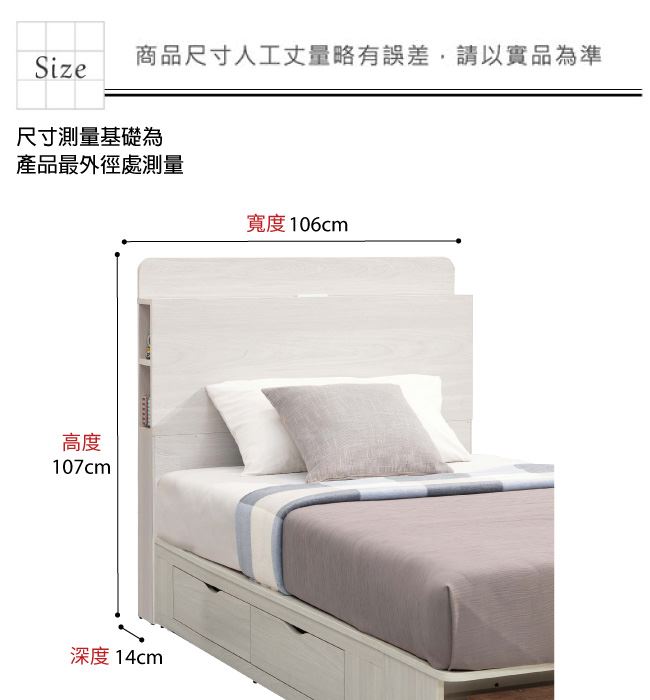 材質 | ◆產品名稱:【綠家居】剛果3.5尺單人可收納床頭片(不含床底+不含床墊) 床頭尺寸:(寬)106x(深)14(高)107/公分 ◆材質: 材質:防蛀木心板+防刮耐磨底座 噴漆:防潮亮面噴漆處理
