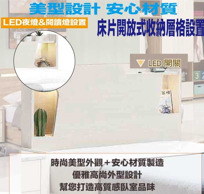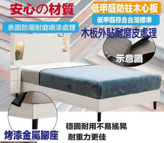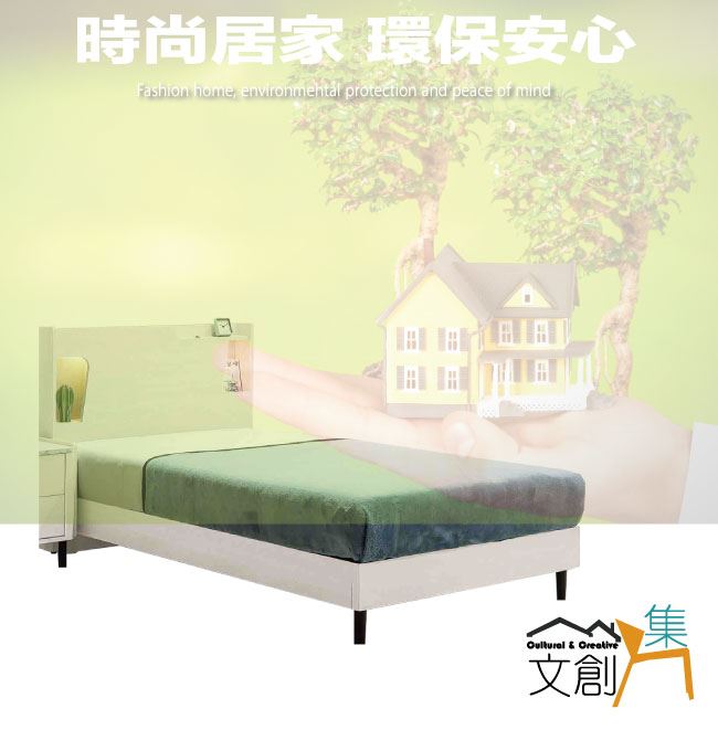 商 品 介 紹 | 【綠家居】菲可達3.5尺單人夜燈床台組合(床頭片+床底+不含床墊) 淺橡木紋色系+現代簡約風格+安心材質製造,整體採用防蛀木心板+六分木床板+防潮耐磨腳座+烤漆金屬腳座+厚實床底支架+仿大理石紋路美耐皿框架等安心材質製造,產品外層採用防潮耐磨噴漆處理搭配採用開放式收納空間+LED閱讀燈/夜燈設置等收納空間設計,全由專人配送到家,專業安心服務,替你省下更多時間! 【商品特色】 淺橡木紋色系+現代簡約風格+安心材質製造,使用放心+搭配居家更便利 採用防蛀木心板+六分木床板+防潮耐磨腳座+烤漆金屬腳座+厚實床底支架+仿大理石紋路美耐皿框架等安心材質製造 產品外層採用防潮耐磨噴漆處理 搭配採用開放式收納空間+LED閱讀燈/夜燈設置等收納空間設計 此商品不需要DIY組立,此商品為組立後之成品 品質保證、專業設計、貼心服務 全由專人配送到家,專業安心服務,替您省下更多時間