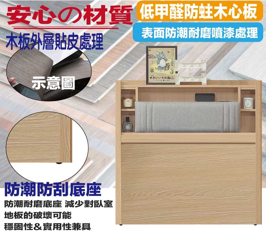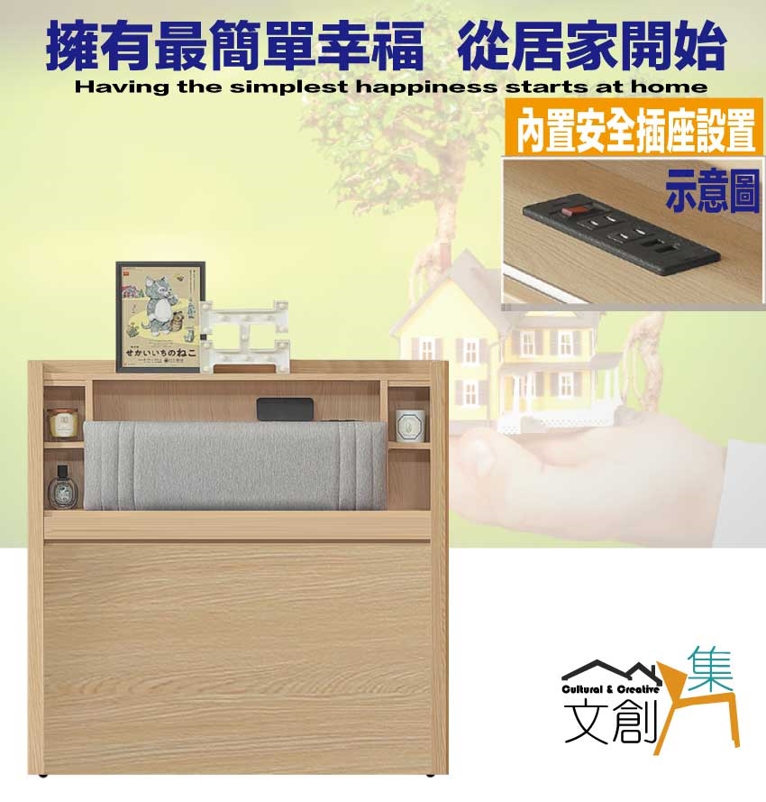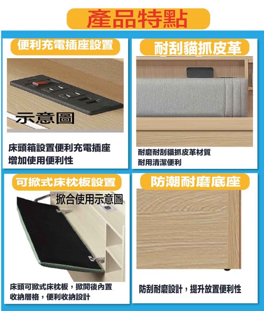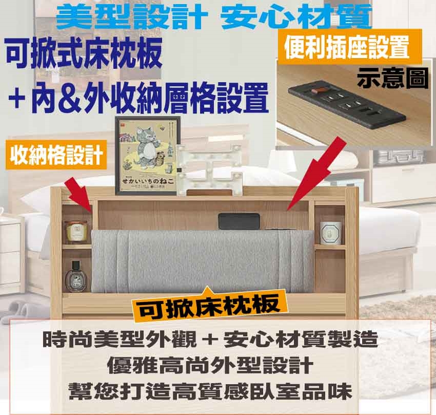 搭配床頭片可掀式床枕板+內&外收納層格+便利插座設置等收納空間設計