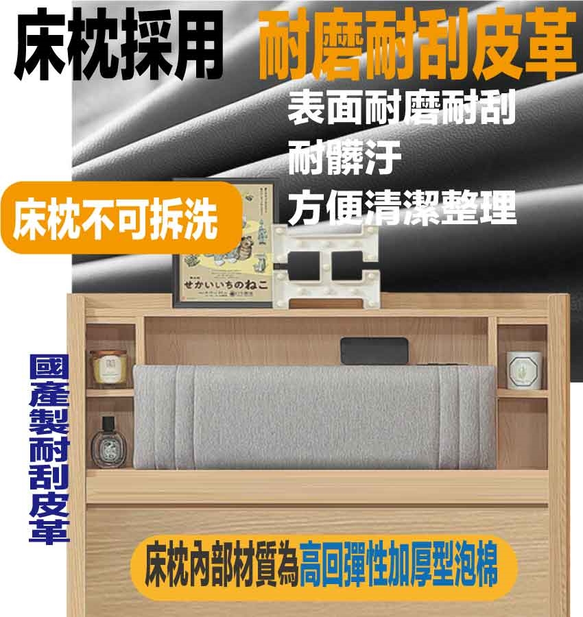 材質:防蛀木心板+防潮耐磨底座+耐磨耐刮皮革+高回彈泡棉