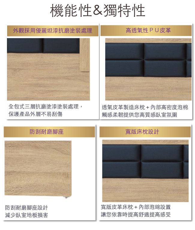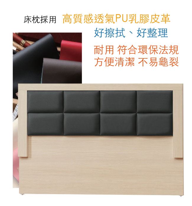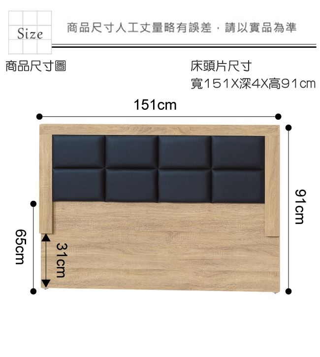材質 | ◆產品名稱:【綠家居】 奧塞提 現代5尺雙人貓抓皮革床頭片(二色可選) 產品尺寸: 床頭尺寸:(寬)151x(深)4x(高)91/公分 ◆材質: 材質:防蛀木心板+耐刮貓抓皮革+高密度泡棉 塗漆:優利坦全包式耐磨噴漆處理 |