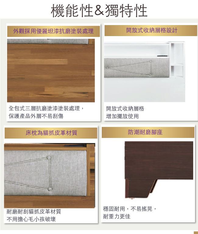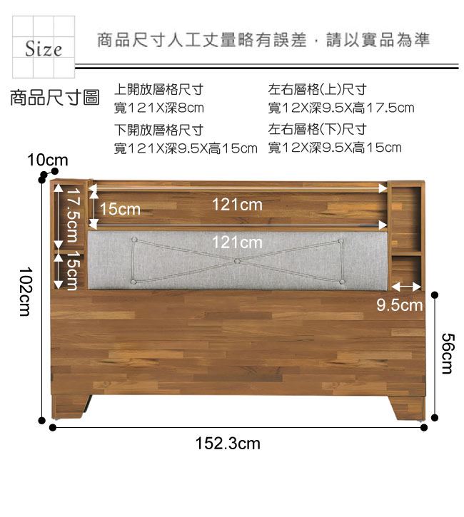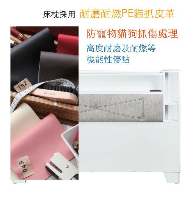 材質 | ◆產品名稱:【綠家居】新德里 現代5尺皮革雙人可收納床頭片(三色可選+不含床底+不含床墊) 產品尺寸: 床頭尺寸:(寬)152.3x(深)10x(高)102/公分 ◆材質: 材質:防蛀木心板 材質:透氣PU皮革+高密度泡棉 塗漆:優利坦三層全包式耐磨塗漆塗裝處理 |