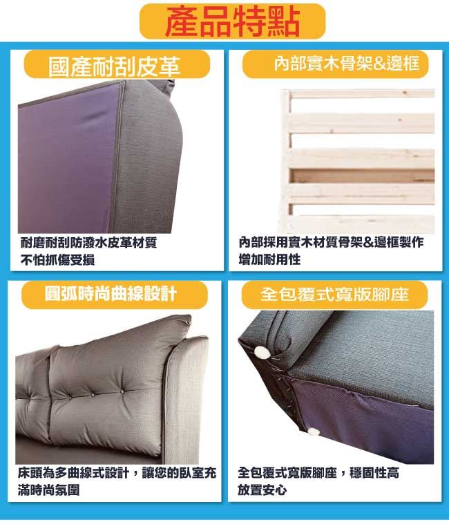 商品 介紹 | 【綠家居】柯瑞5尺超耐刮皮革雙人床頭片(10色可選+不含床底+不含床墊) 10色可選+現代簡約風格+安心材質製造,整體採用內置實木骨架&實木材質邊框+國產高科技超耐刮皮革+高密度泡棉等安心材質製造,全由專人配送到家,專業安心服務,替你省下更多時間! 【商品特色】 10色可選+現代簡約風格+安心材質製造,使用放心+搭配居家更便利 採用內置實木骨架&實木材質邊框+國產高科技超耐刮皮革+高密度泡棉等安心材質製造 此商品不需要DIY組立,此商品為組立後之成品 品質保證、專業設計、貼心服務 全由專人配送到家,專業安心服務,替您省下更多時間 備註:1,國內自家工廠製造,採用高標準要求選材備料製造,另可訂製其他顏色喔,歡迎詢問訂製相關事宜 2,床底底部配置的黑漆可調圓柱形腳座另有10cm&15cm高度可洽詢選配 3,選購顏色可參考內文圖片的色系,專人會致電給您做顏色確認,避免顏色認知不同產生爭議 4,本產品屬接單後專人訂製全新產品後安排出貨,接單後備貨製作時間約為3-7個工作天(不含配送時間安排),選購時請您先確認可以等待喔!請您見諒! |