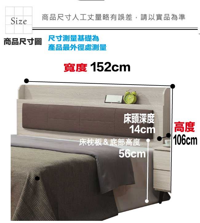 材質 | ◆產品名稱:【綠家居】麥比5尺貓抓皮革雙人可收納床頭片(二色可選+不含床底+不含床墊) 床頭尺寸:(寬)152x(深)14(高)106/公分 ◆材質: 材質:防蛀木心板+耐磨貓抓皮革+高密度泡棉 噴漆:防潮耐磨噴漆處理 |