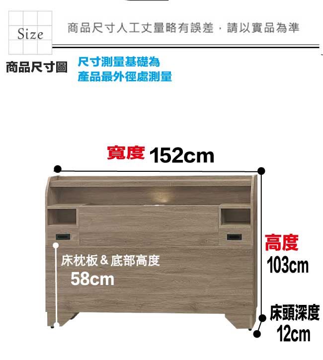 材質 | ◆產品名稱:【綠家居】瑞希5尺雙人可收納床頭片(三色可選+LED&插座設置) 床頭尺寸:(寬)152x(深)12(高)103/公分 ◆材質: 材質:防蛀木心板 噴漆:防潮耐磨噴漆處理 |