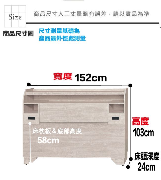 材質 | ◆產品名稱:【綠家居】瑞希三插座5尺雙人可收納床頭片(三色可選) 床頭尺寸:(寬)152x(深)24(高)103/公分 ◆材質: 材質:防蛀木心板 噴漆:防潮耐磨噴漆處理 |