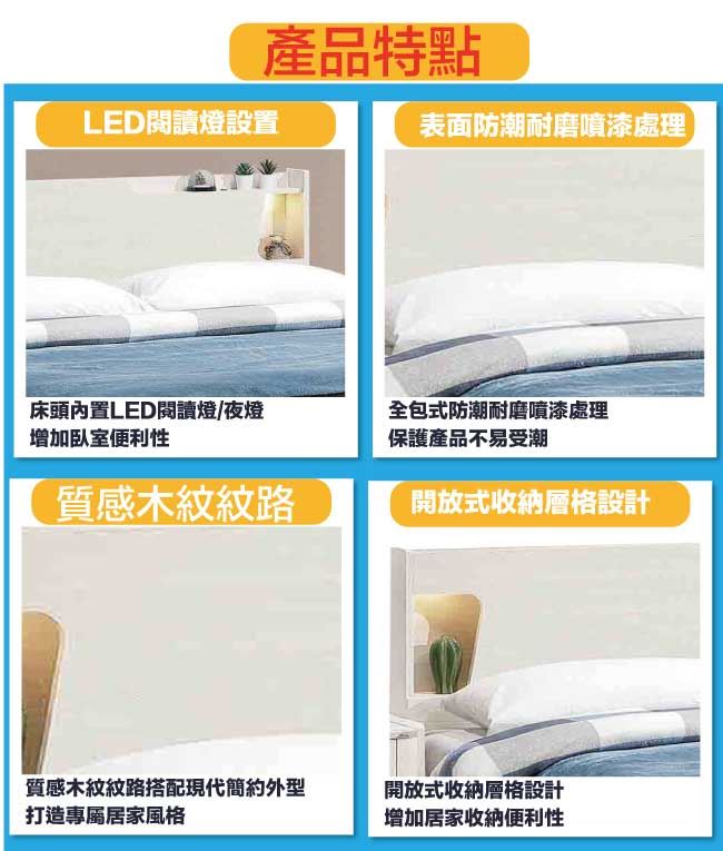 商 品 介 紹 | 【綠家居】菲可達5尺雙人夜燈床台組合(床頭片+床底+不含床墊) 淺橡木紋色系+現代簡約風格+安心材質製造,整體採用防蛀木心板+六分木床板+防潮耐磨腳座+烤漆金屬腳座+厚實床底支架+仿大理石紋路美耐皿框架等安心材質製造,產品外層採用防潮耐磨噴漆處理搭配採用開放式收納空間+LED閱讀燈/夜燈設置等收納空間設計,全由專人配送到家,專業安心服務,替你省下更多時間! 【商品特色】 淺橡木紋色系+現代簡約風格+安心材質製造,使用放心+搭配居家更便利 採用防蛀木心板+六分木床板+防潮耐磨腳座+烤漆金屬腳座+厚實床底支架+仿大理石紋路美耐皿框架等安心材質製造 產品外層採用防潮耐磨噴漆處理 搭配採用開放式收納空間+LED閱讀燈/夜燈設置等收納空間設計 此商品不需要DIY組立,此商品為組立後之成品 品質保證、專業設計、貼心服務 全由專人配送到家,專業安心服務,替您省下更多時間