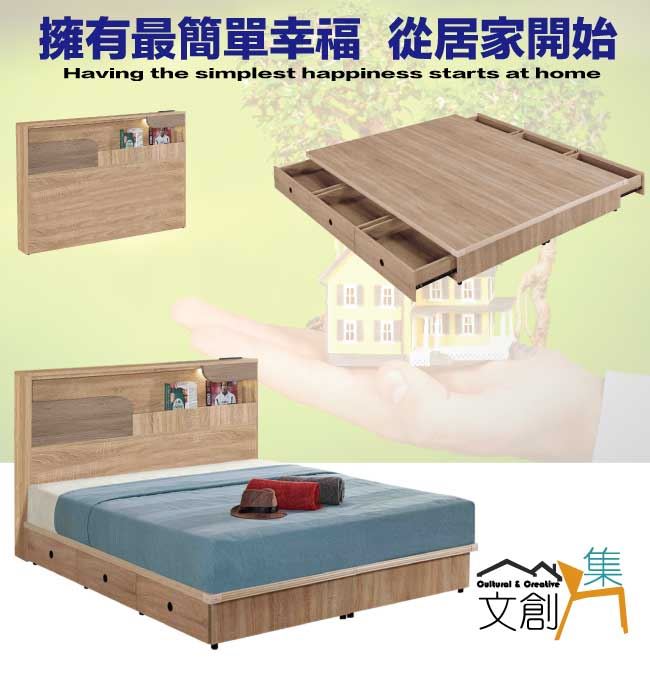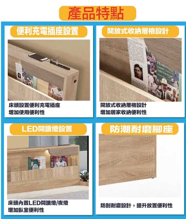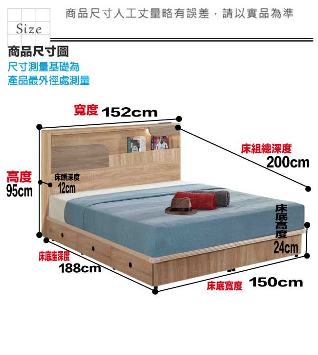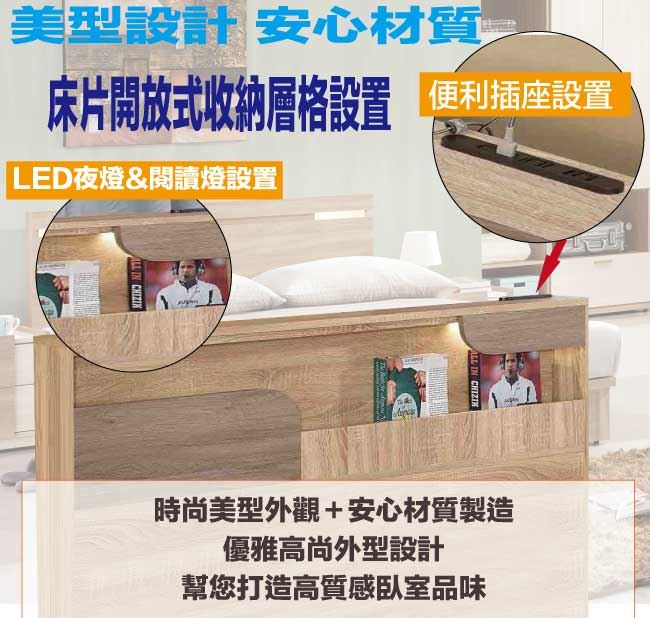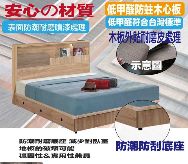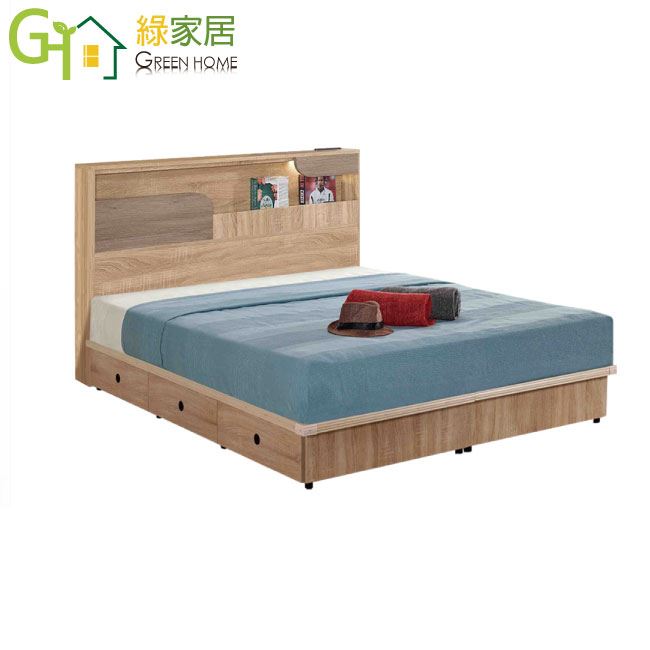 商 品 介 紹 | 【綠家居】巴斯亞5尺雙人夜燈六抽床台組合(床頭片+六抽床底+不含床墊) 深橡木紋色系+現代簡約風格+安心材質製造,整體採用防蛀木心板+六分木床板+防潮耐磨腳座等安心材質製造,產品外層採用防潮耐磨噴漆處理搭配採用開放式收納空間+LED閱讀燈+便利插座設置+床底座雙邊開合六抽屜等收納空間設計,全由專人配送到家,專業安心服務,替你省下更多時間! 【商品特色】 深橡木紋色系+現代簡約風格+安心材質製造,使用放心+搭配居家更便利 採用防蛀木心板+六分木床板+防潮耐磨腳座等安心材質製造 產品外層採用防潮耐磨噴漆處理 搭配採用開放式收納空間+LED閱讀燈+便利插座設置+床底座雙邊開合六抽屜等收納空間設計 此商品不需要DIY組立,此商品為組立後之成品 品質保證、專業設計、貼心服務 全由專人配送到家,專業安心服務,替您省下更多時間