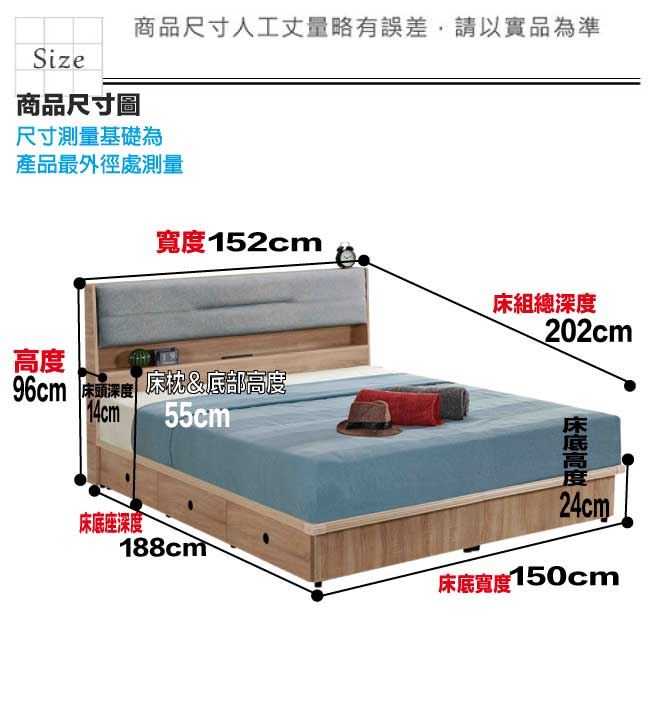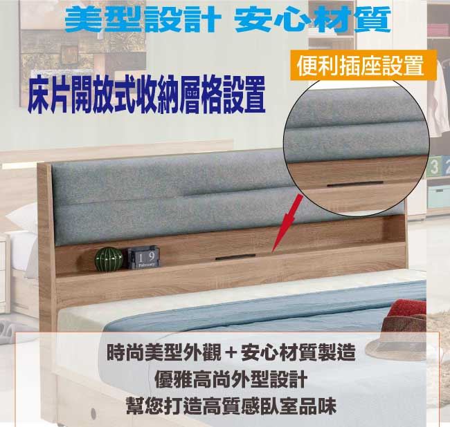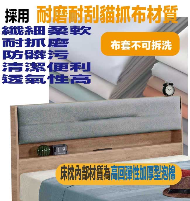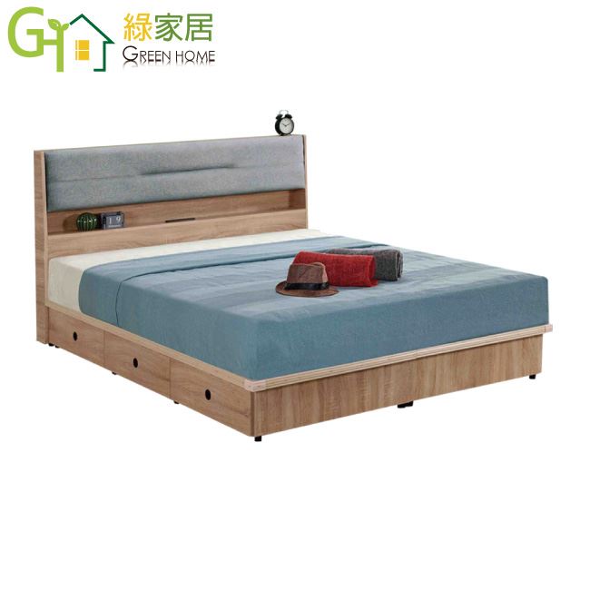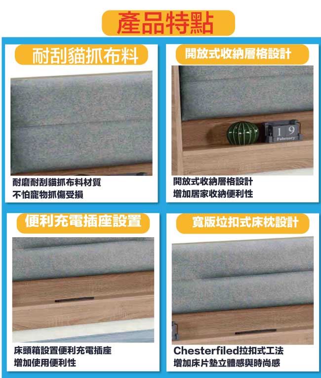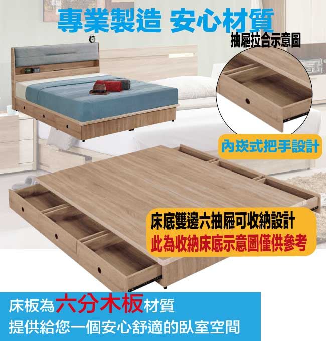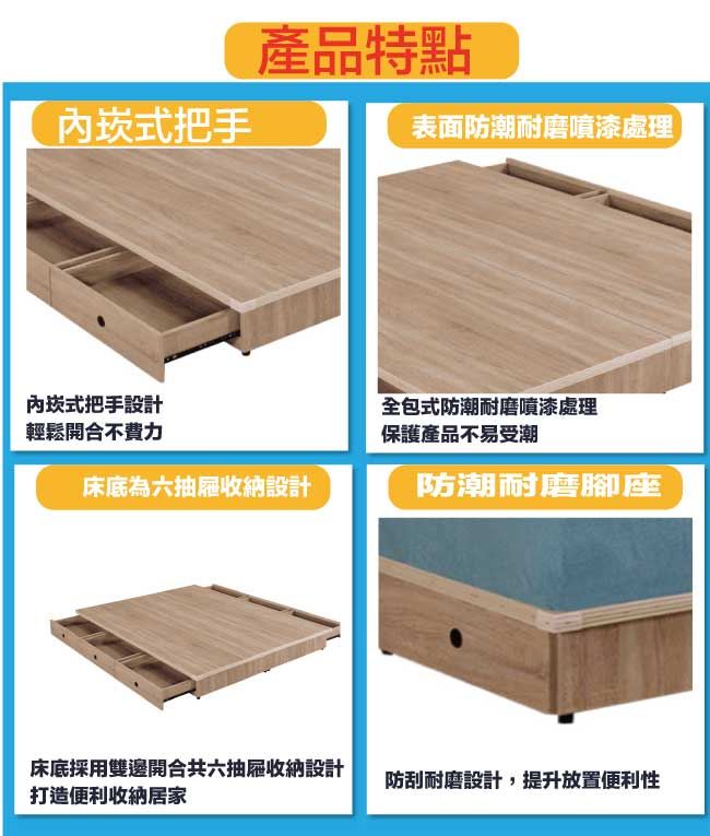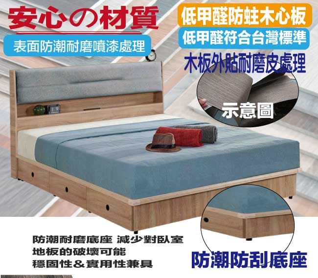 商 品 介 紹 | 【綠家居】巴斯亞5尺雙人貓抓布六抽床台組合 (床頭片+六抽床底+不含床墊) 深橡木紋色系+現代簡約風格+安心材質製造,整體採用防蛀木心板+六分木床板+防潮耐磨腳座+耐磨貓抓布+高回彈泡棉等安心材質製造,產品外層採用防潮耐磨噴漆處理搭配採用開放式收納空間+便利插座設置+床底座雙邊開合六抽屜等收納空間設計,全由專人配送到家,專業安心服務,替你省下更多時間! 【商品特色】 深橡木紋色系+現代簡約風格+安心材質製造,使用放心+搭配居家更便利 採用防蛀木心板+六分木床板+防潮耐磨腳座+耐磨貓抓布+高回彈泡棉等安心材質製造 產品外層採用防潮耐磨噴漆處理 搭配採用開放式收納空間+便利插座設置+床底座雙邊開合六抽屜等收納空間設計 此商品不需要DIY組立,此商品為組立後之成品 品質保證、專業設計、貼心服務 全由專人配送到家,專業安心服務,替您省下更多時間