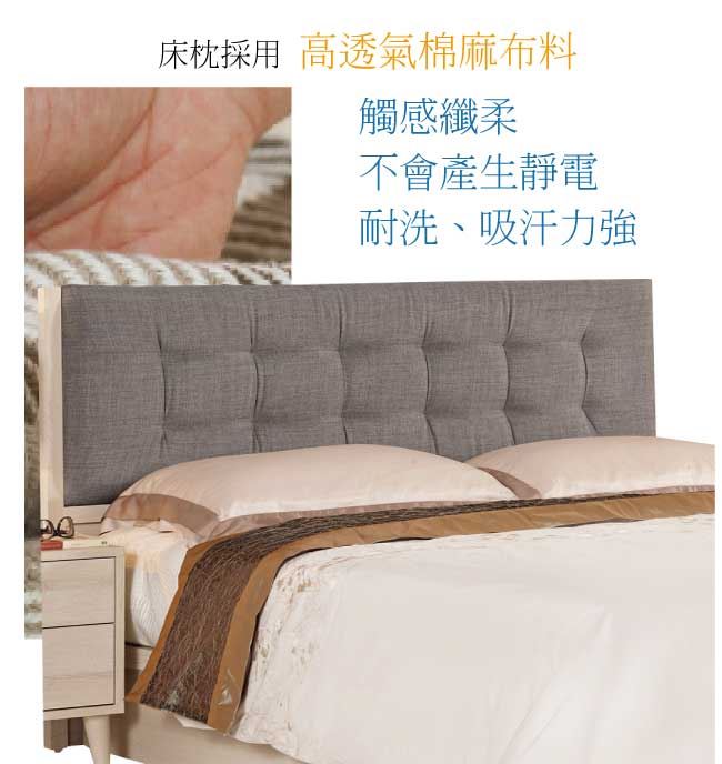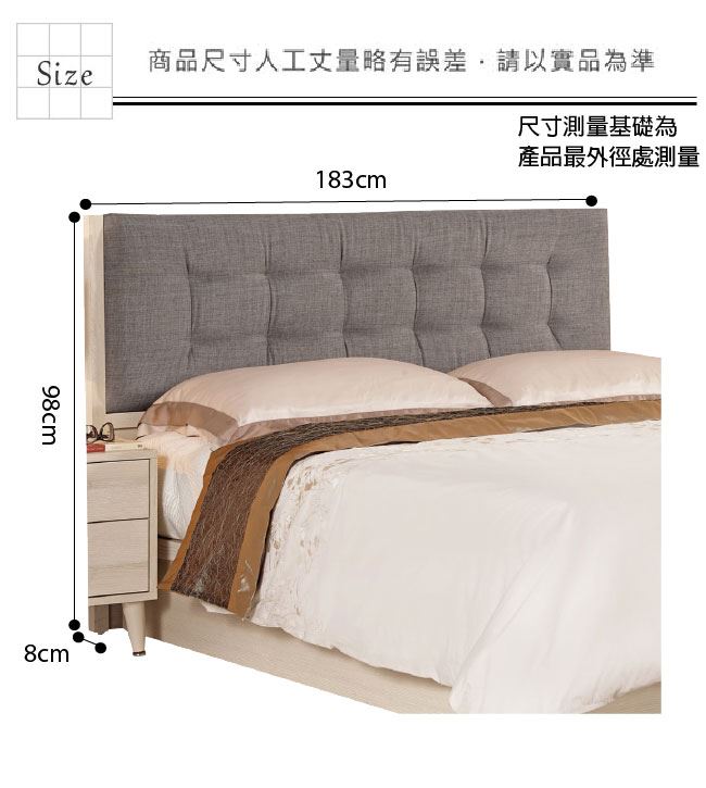 材質 | ◆產品名稱: 【綠家居】艾嘉柏 淺橡6尺雙人加大棉麻布床頭片(不含床底+不含床墊) 床頭片尺寸:(寬)183x(深)8(高)98/公分 ◆材質: 材質:防蛀木心板+透氣棉麻布+高密度泡棉 噴漆:防潮耐磨噴漆處理