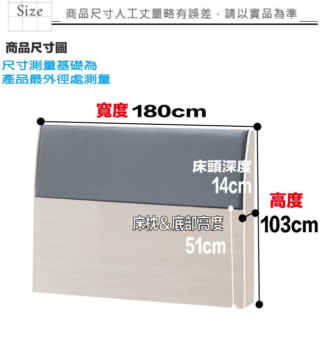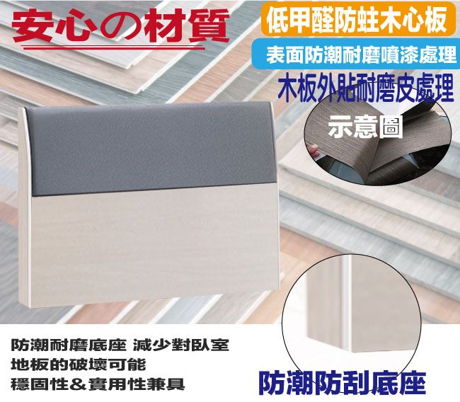 材質 | ◆產品名稱:【綠家居】萊迪6尺雙人加大貓抓皮革床頭片(不含床底+不含床墊) 床頭尺寸:(寬)180x(深)14x(高)103/公分 ◆材質: 材質:防蛀木心板+防潮耐磨腳座+耐刮貓抓皮革+高彈力泡棉 噴漆:防潮耐磨噴漆處理 |