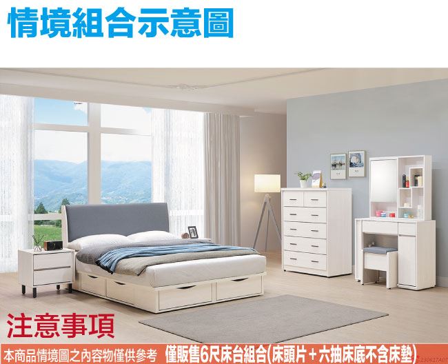 材質 | ◆產品名稱:【綠家居】萊迪6尺雙人加大貓抓皮革可收納六抽床台組合(床頭片+六抽床底+不含床墊) 床頭尺寸:(寬)180x(深)14x(高)103/公分 床底尺寸:(寬)181x(深)188(高)26/公分 床台組合尺寸:(寬)181x(深)202(高)103/公分 ◆材質: 材質:防蛀木心板+六分木床板+防潮耐磨腳座+耐刮貓抓皮革+高彈力泡棉 噴漆:防潮耐磨噴漆處理 |