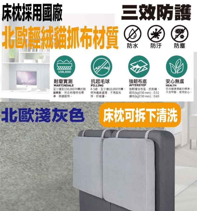 商 品 介 紹 | 【綠家居】菲達斯6尺雙人加大貓抓布&皮革床頭片 時尚雙色系(淺灰+深灰色系)+現代簡約風格+安心材質製造,整體採用內置實木框架+防潮包覆底座+耐磨貓抓皮革+輕絨貓抓布料+高回彈泡棉等安心材質製造,全由專人配送到家,專業安心服務,替你省下更多時間! 【商品特色】 時尚雙色系(淺灰+深灰色系)+現代簡約風格+安心材質製造,使用放心+搭配居家更便利 採用內置實木框架+防潮包覆底座+耐磨貓抓皮革+輕絨貓抓布料+高回彈泡棉等安心材質製造 此商品不需要DIY組立,此商品為組立後之成品 品質保證、專業設計、貼心服務 全由專人配送到家,專業安心服務,替您省下更多時間