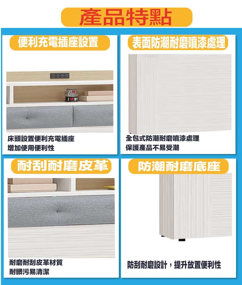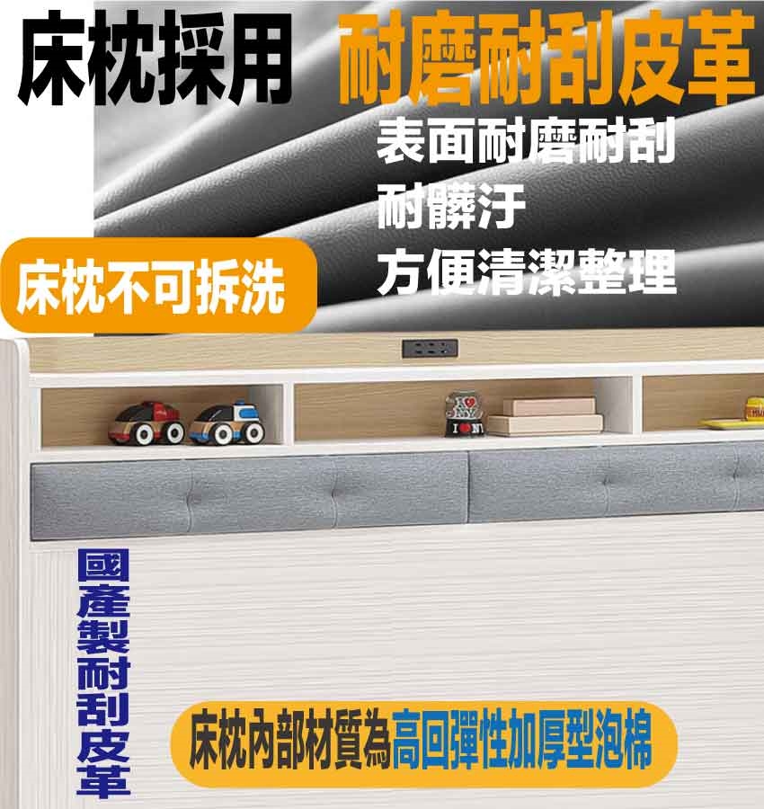 材質:防蛀木心板+防潮耐磨底座+耐磨耐刮皮革+高回彈泡棉