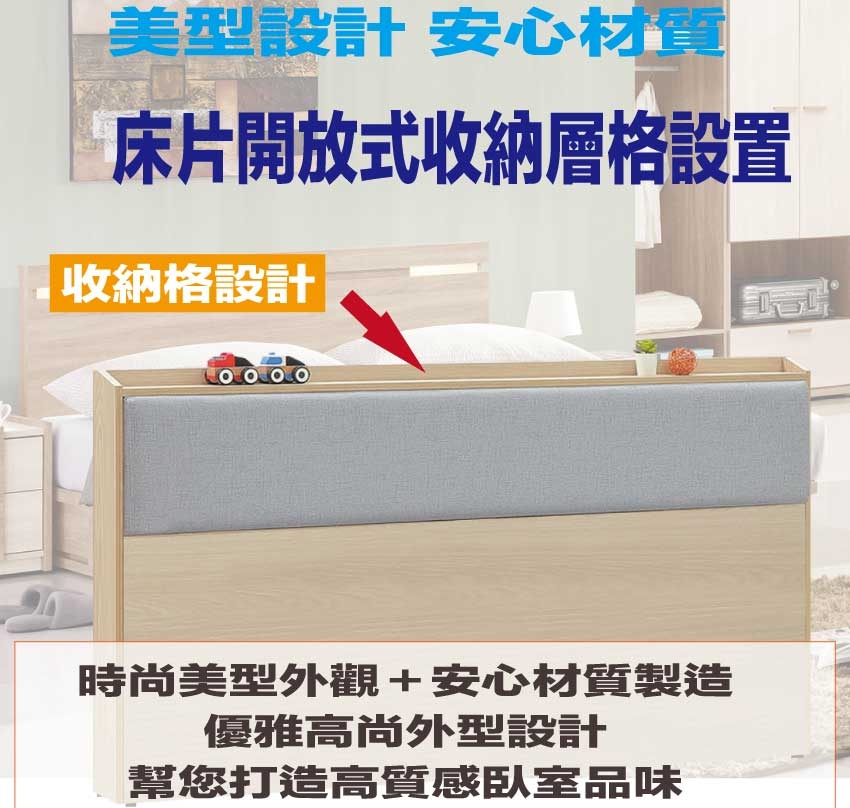 搭配床頭採用開放收納層格收納空間設計