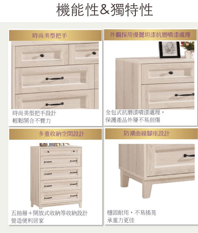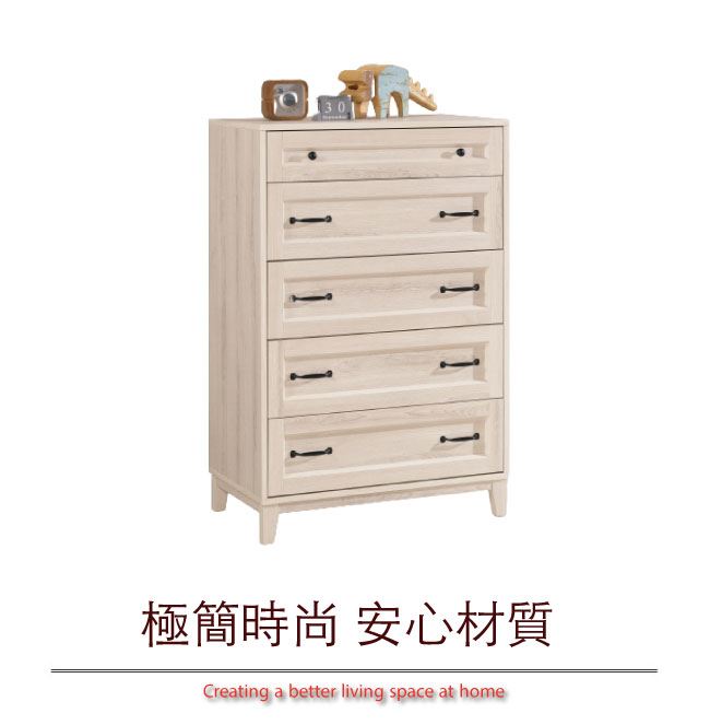 商品介紹 | 【綠家居】馬拉提 淺橡2.7尺五抽斗櫃/收納櫃 淺橡木紋色系+現代簡約風格+安心材質製造,鏡台整體採用防蛀木心板+五金滑軌結構+防潮耐磨腳座等安心材質製造,外層採用優利坦全包式耐磨噴漆處理搭配五抽屜+開放式收納等收納設計,全由專人配送到家,專業安心服務,替你省下更多時間! 【商品特色】 淺橡木紋色系+現代簡約風格+安心材質製造,使用放心+搭配居家更便利 採用防蛀木心板+五金滑軌結構+防潮耐磨腳座等安心材質製造 五抽屜+開放式收納等收納設計 此商品不需要DIY組立,此商品為組立後之成品 品質保證、專業設計、貼心服務 全由專人配送到家,專業安心服務,替您省下更多時間 |
