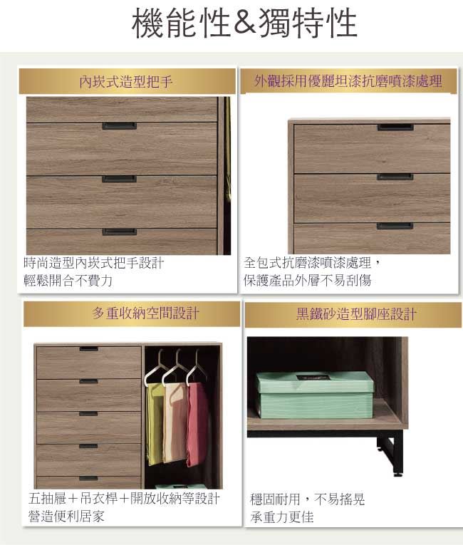 商品 介紹 | 【綠家居】西德 時尚3.6尺五抽衣斗櫃 胡桃木紋色系+現代簡約風格+安心材質製造,鏡台整體採用防蛀木心板+五金滑軌結構+黑鐵砂腳座等安心材質製造,外層採用優利坦全包式耐磨噴漆處理搭配吊衣桿+五抽屜+開放式收納等收納空間設計,全由專人配送到家,專業安心服務,替你省下更多時間! 【商品特色】 胡桃木紋色系+現代簡約風格+安心材質製造,使用放心+搭配居家更便利 採用防蛀木心板+五金滑軌結構+黑鐵砂腳座等安心材質製造 吊衣桿+五抽屜+開放式收納等收納空間設計 此商品不需要DIY組立,此商品為組立後之成品 品質保證、專業設計、貼心服務 全由專人配送到家,專業安心服務,替您省下更多時間 |