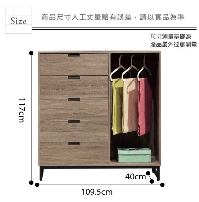 材質 | ◆產品名稱: 【綠家居】西德 時尚3.6尺五抽衣斗櫃 產品尺寸: 尺寸:(寬)109.5x(深)40x(高)117/公分 ◆材質: 材質:防蛀木心板+黑鐵砂腳座 材質:五金滑軌結構 塗漆:優利坦全包式耐磨噴漆處理