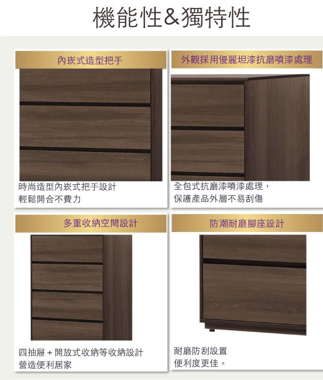 商 品 介 紹 | 【綠家居】雷迪 時尚3尺四抽斗櫃/收納櫃 木紋雙色系+現代簡約風格+安心材質製造,整體採用防蛀木心板+五金滑軌結構+防刮耐磨腳座等安心材質製造,外層採用防潮耐磨噴漆處理搭配採用四抽屜+開放式收納層格等收納空間設計,全由專人配送到家,專業安心服務,替你省下更多時間! 【商品特色】 木紋雙色系+現代簡約風格+安心材質製造,使用放心+搭配居家更便利 採用防蛀木心板+五金滑軌結構+防刮耐磨腳座等安心材質製造 採用四抽屜+開放式收納層格等收納空間設計 此商品不需要DIY組立,此商品為組立後之成品 品質保證、專業設計、貼心服務 全由專人配送到家,專業安心服務,替您省下更多時間 |