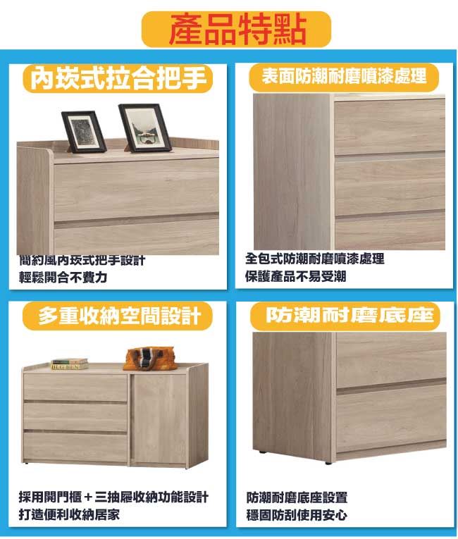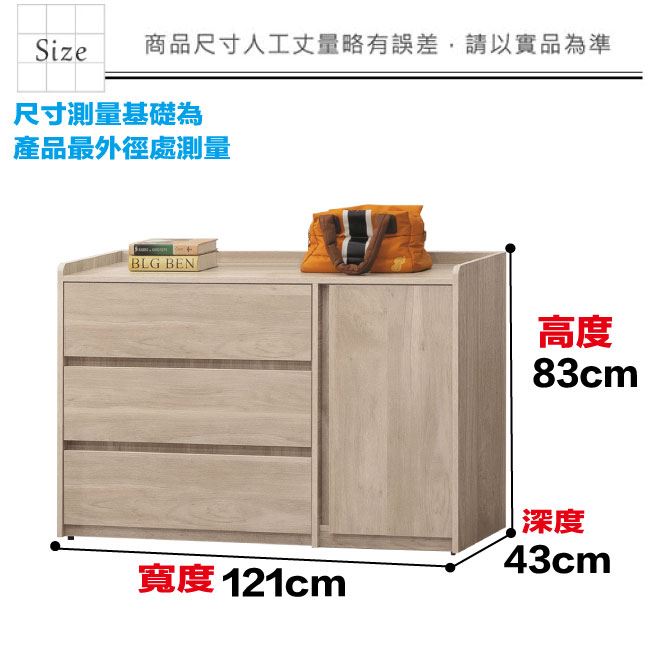 材質 | ◆產品名稱:【綠家居】曼特4尺三抽單開門斗櫃(二色可選) 尺寸:(寬)121x(深)43(高)83/公分 ◆材質: 材質:防蛀木心板++五金滑軌結構+防潮耐磨腳座 噴漆:外層採用防潮耐磨噴漆處理 |