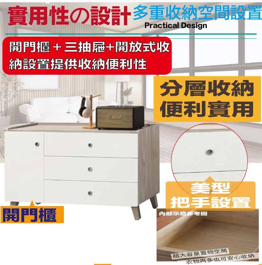 採用開門櫃+三抽屜+內開放式層格等收納空間設計