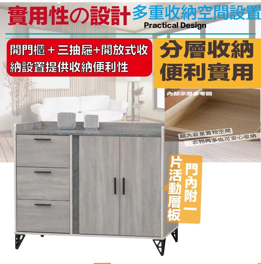 搭配採用開門櫃+三抽屜+內三開放層格等收納空間設計