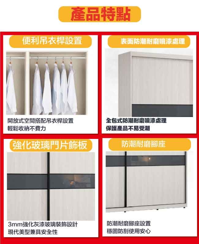 商 品 介 紹 | 【綠家居】摩克7.5尺四吊衣桿二抽拉盤推門衣櫃/收納櫃 淺橡木紋色系+現代簡約風格+安心材質製造,整體採用防蛀木心板+防潮耐磨腳座+五金滑軌結構+5mm強化灰漆強化灰漆玻璃門片飾板等安心材質製造,產品外層採用防潮耐磨噴漆處理搭配採用推門櫃+吊衣桿+二抽屜+拉盤層架+內開放層格等收納空間設計,全由專人配送到家,專業安心服務,替你省下更多時間! 淺橡木紋色系+現代簡約風格+安心材質製造,使用放心+搭配居家更便利 採用防蛀木心板+防潮耐磨腳座+五金滑軌結構+5mm強化灰漆強化灰漆玻璃門片飾板等安心材質製造 產品外層採用防潮耐磨噴漆處理 採用推門櫃+吊衣桿+二抽屜+拉盤層架+內開放層格等收納空間設計 此商品不需要DIY組立,此商品為組立後之成品 品質保證、專業設計、貼心服務 全由專人配送到家,專業安心服務,替您省下更多時間 |
