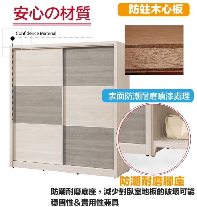 材質 | ◆產品名稱:【綠家居】芙娜雙色6.1尺推門衣櫃/收納櫃 推門衣櫃尺寸:(寬)182.7(深)60.3(高)197公分 ◆材質: 材質:防蛀木心板+防潮耐磨腳座+五金滑軌結構 噴漆:防潮耐磨噴漆處理