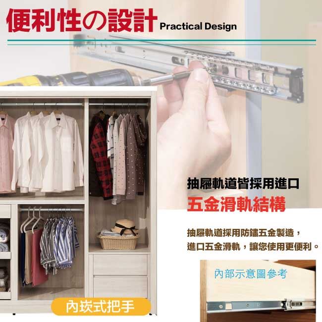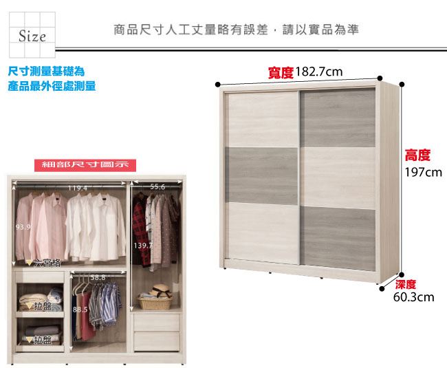 商 品 介 紹 | 【綠家居】芙娜雙色6.1尺推門衣櫃/收納櫃 木紋雙色系+現代簡約風格+安心材質製造,整體採用防蛀木心板+防潮耐磨腳座+五金滑軌結構等安心材質製造,產品外層採用防潮耐磨噴漆處理搭配採用推門櫃+吊衣桿+三抽屜(多宮格抽屜)+拉盤式層架+內開放式層格等收納空間設計,全由專人配送到家,專業安心服務,替你省下更多時間! 木紋雙色系+現代簡約風格+安心材質製造,使用放心+搭配居家更便利 採用防蛀木心板+防潮耐磨腳座+五金滑軌結構等安心材質製造 產品外層採用防潮耐磨噴漆處理 採用推門櫃+吊衣桿+三抽屜(多宮格抽屜)+拉盤式層架+內開放式層格等收納空間設計 此商品不需要DIY組立,此商品為組立後之成品 品質保證、專業設計、貼心服務 全由專人配送到家,專業安心服務,替您省下更多時間 |