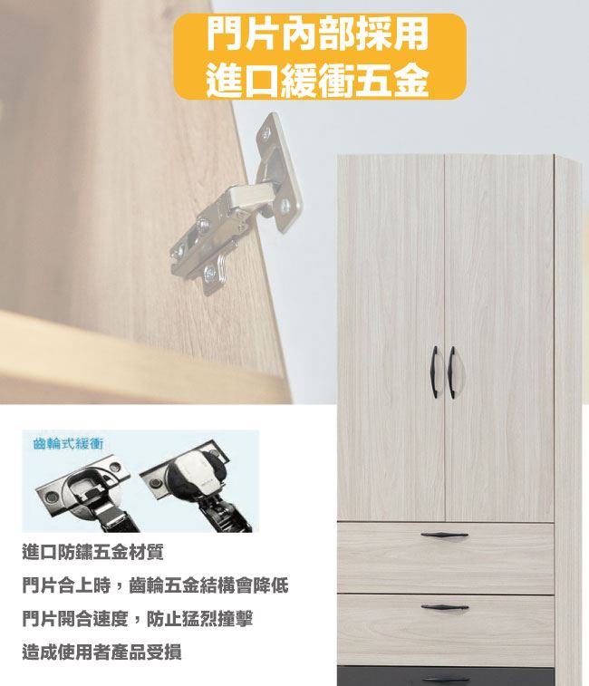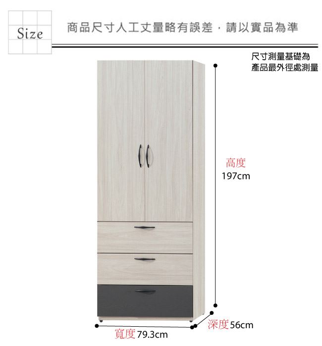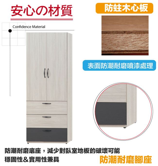 材質 | ◆產品名稱:【綠家居】路多雙色2.6尺二門三抽衣櫃 尺寸:(寬)79.3x(深)56(高)197/公分 ◆材質: 材質:防蛀木心板+防潮耐磨腳座+防夾手緩衝門片五金+五金滑軌結構 噴漆:防潮耐磨噴漆處理
