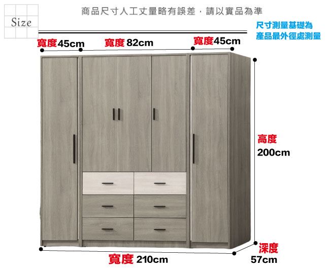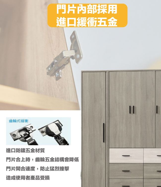 材質 | ◆產品名稱:【綠家居】琳諾7尺五門六抽衣櫃組合 尺寸:(寬)210x(深)57(高)200/公分 ◆材質: 材質:防蛀木心板+防潮耐磨腳座+防夾手緩衝門片五金+五金滑軌結構 噴漆:防潮耐磨噴漆處理