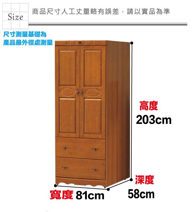 材質 | ◆產品名稱:【綠家居】秋意2.7尺實木二門二抽衣櫃 尺寸:(寬)81x(深)58x(高)203/公分 ◆材質: 材質:楠檜實木+防蛀木心板+防潮耐磨底座+五金滑軌結構 噴漆:防潮耐磨噴漆處理 |