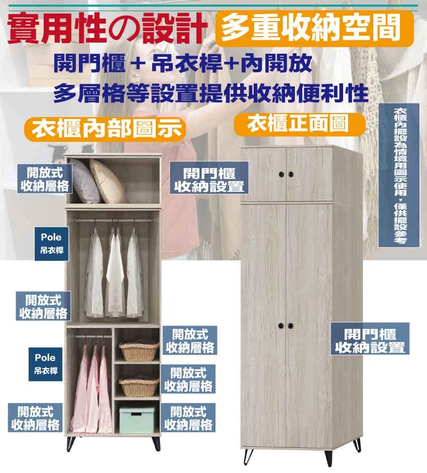 採用開門櫃+吊衣桿+內開放層格等收納空間設計