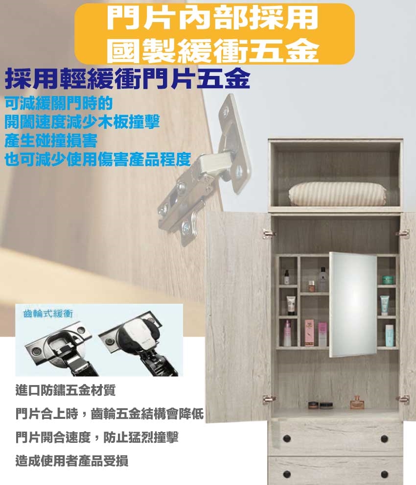 防蛀木心板+烤漆金屬腳座+防夾手緩衝門片五金+強化玻璃鏡面等安心材質製造