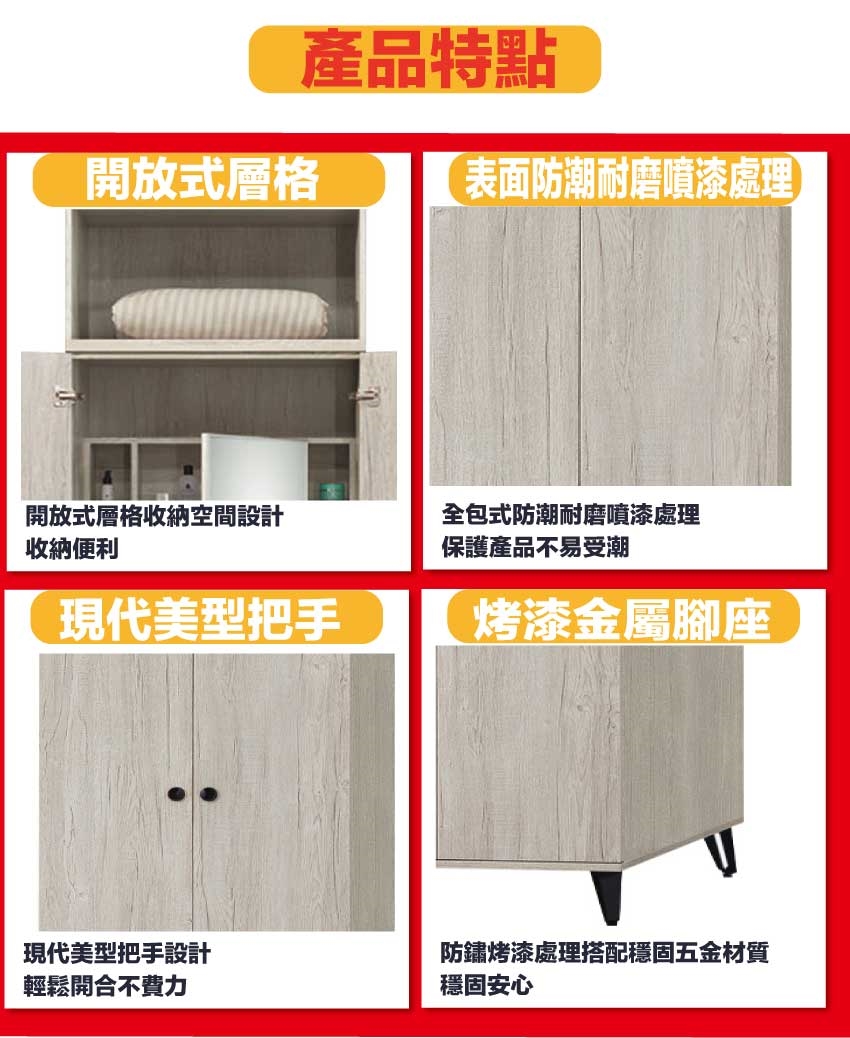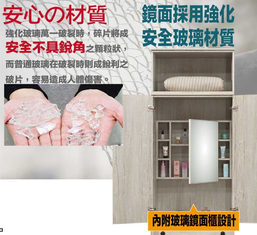 材質:防蛀木心板+烤漆金屬腳座+防夾手緩衝門片五金+強化玻璃鏡面