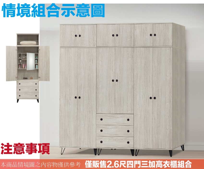 - ◆產品名稱:【綠家居】摩帝2.6尺四門三抽加高衣櫃組合(內置開門鏡面櫃)
