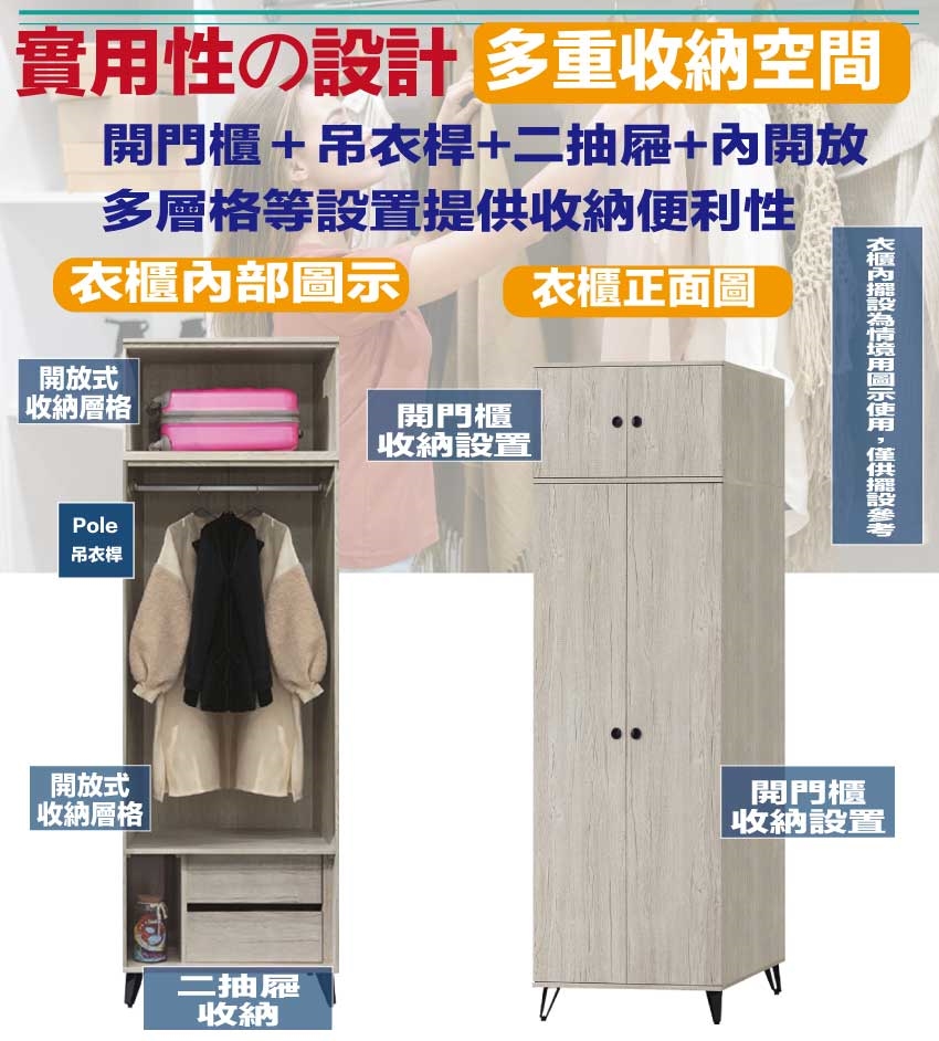 採用開門櫃+吊衣桿+二抽屜+內開放層格等收納空間設計