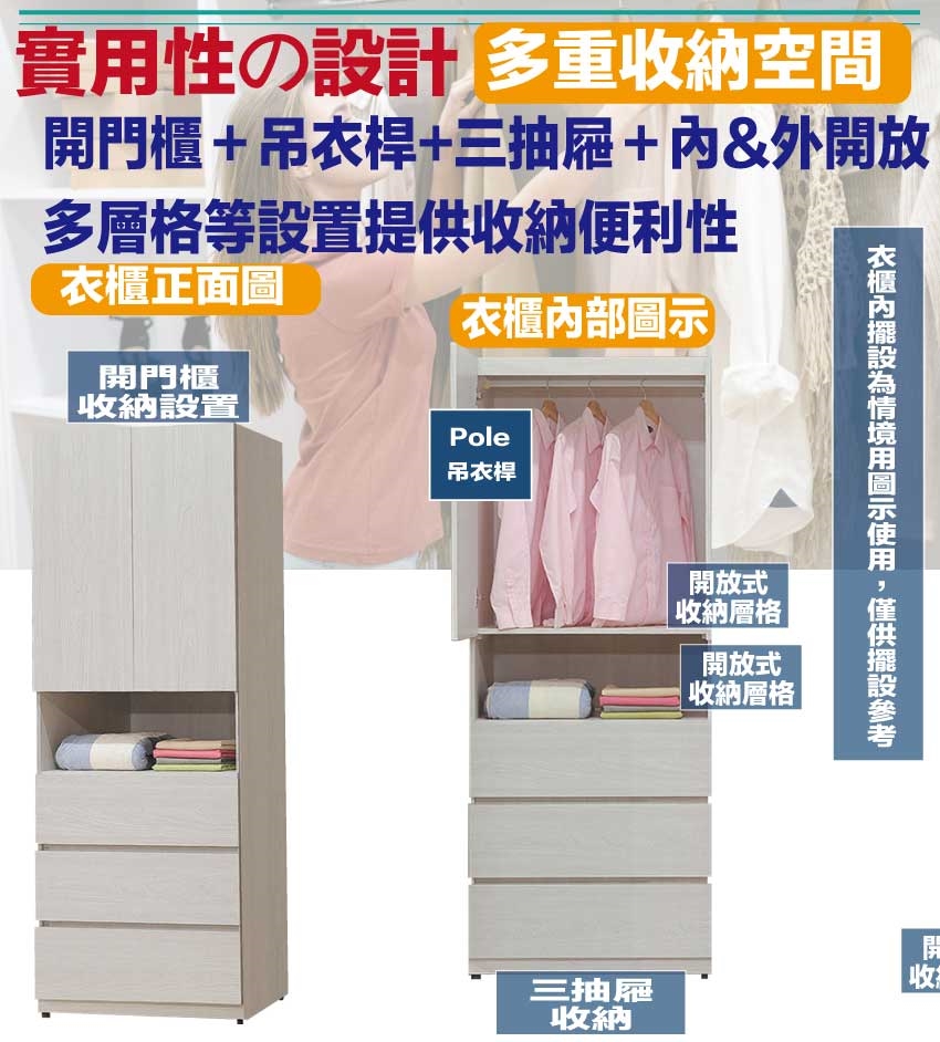 採用開門櫃+吊衣桿+三抽屜+內&外開放層格等收納空間設計