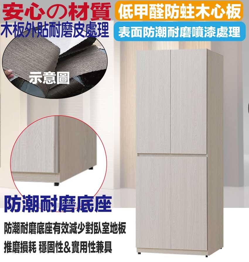 ★偏遠地區需額外加收運費,下標請先問與答詢問★ ★下訂前注意 由於商品流動較快,下訂前請先詢問是否有貨在下訂喔~★ 【綠家居】福登2.5尺四門內雙吊衣櫃 淺橡木紋色系+現代簡約風格+安心材質製造,使用放心+搭配居家更便利,整體採用防蛀木心板+防潮耐磨底座(可調高低水平)+防夾手緩衝門片五金等安心材質製造搭配外層採用防潮耐磨噴漆處理 ,採用開門櫃+吊衣桿+內開放層格等收納空間設計,全由專人配送到家,專業安心服務,替你省下更多時間!