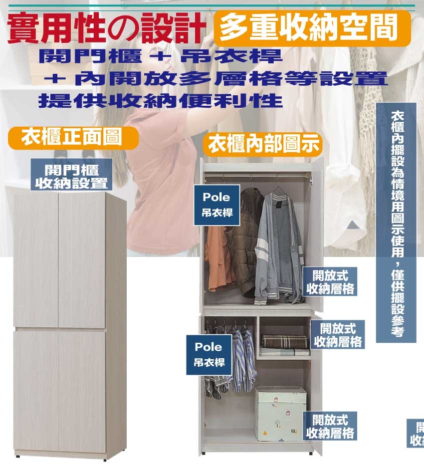 採用開門櫃+吊衣桿+內開放層格等收納空間設計