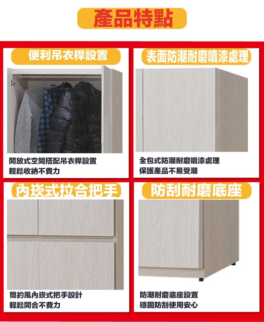 材質:防蛀木心板+防潮耐磨底座(可調高低水平)+防夾手緩衝門片五金