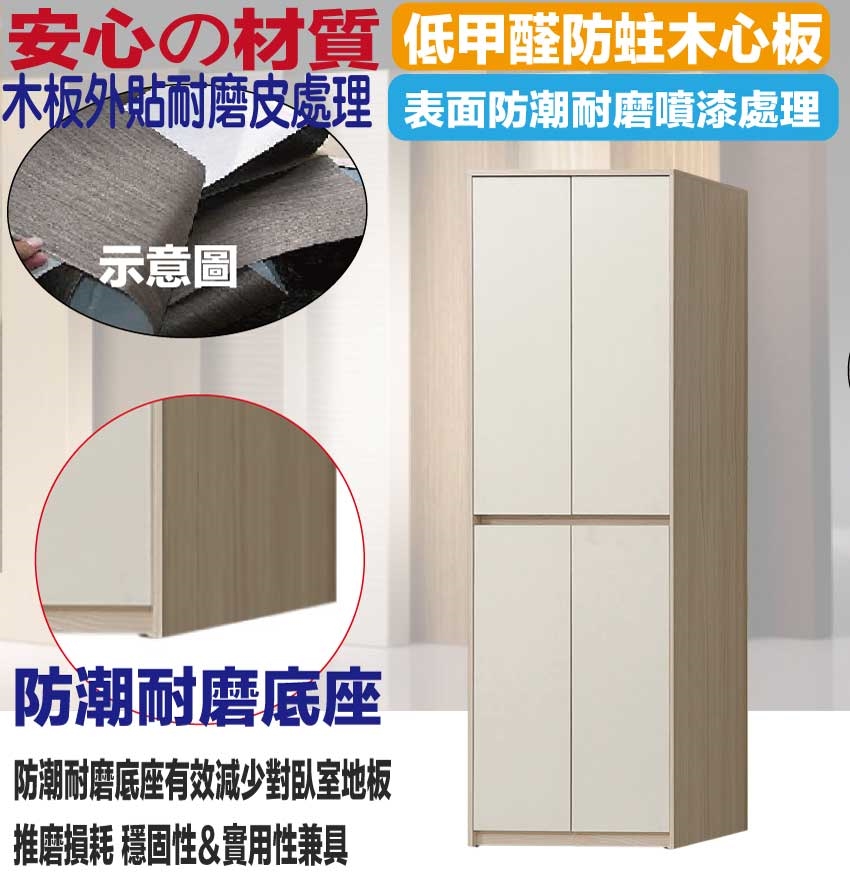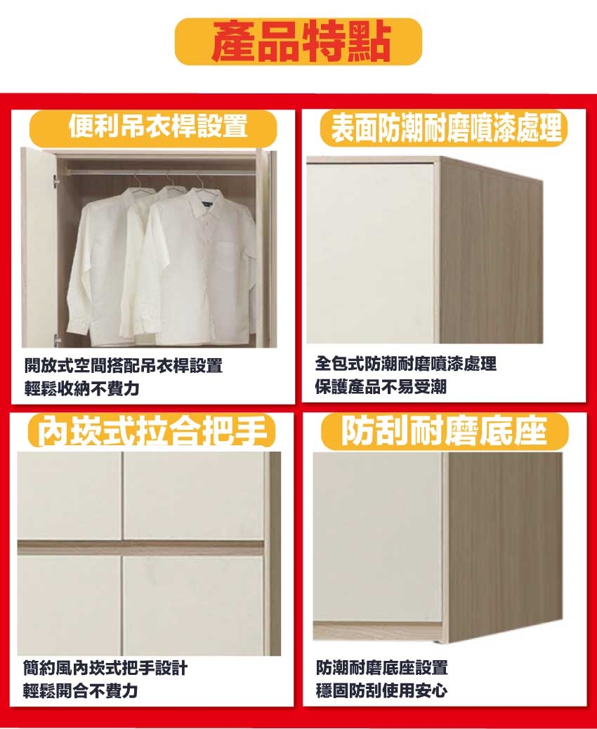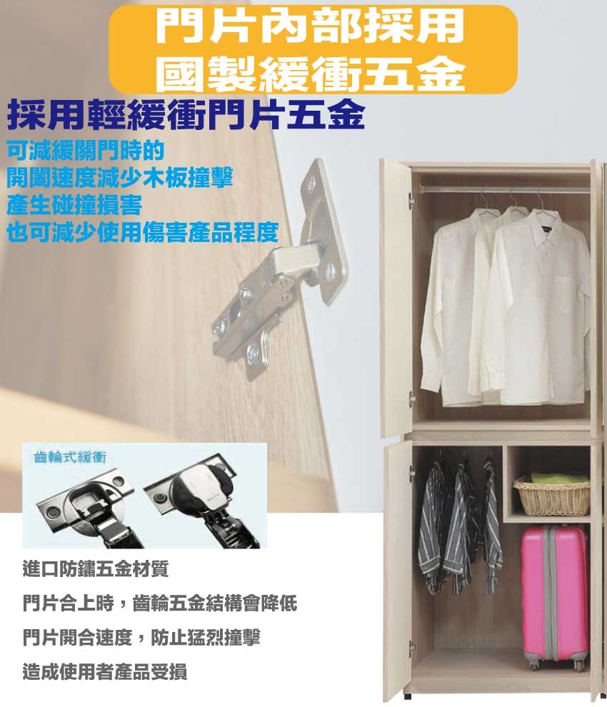 材質:防蛀木心板+防潮耐磨底座(可調高低水平)+防夾手緩衝門片五金