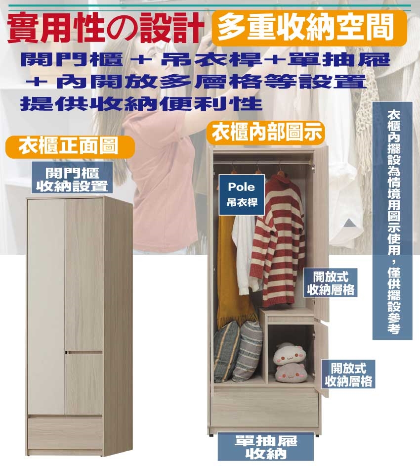 採用開門櫃+吊衣桿+單抽屜+內開放層格等收納空間設計