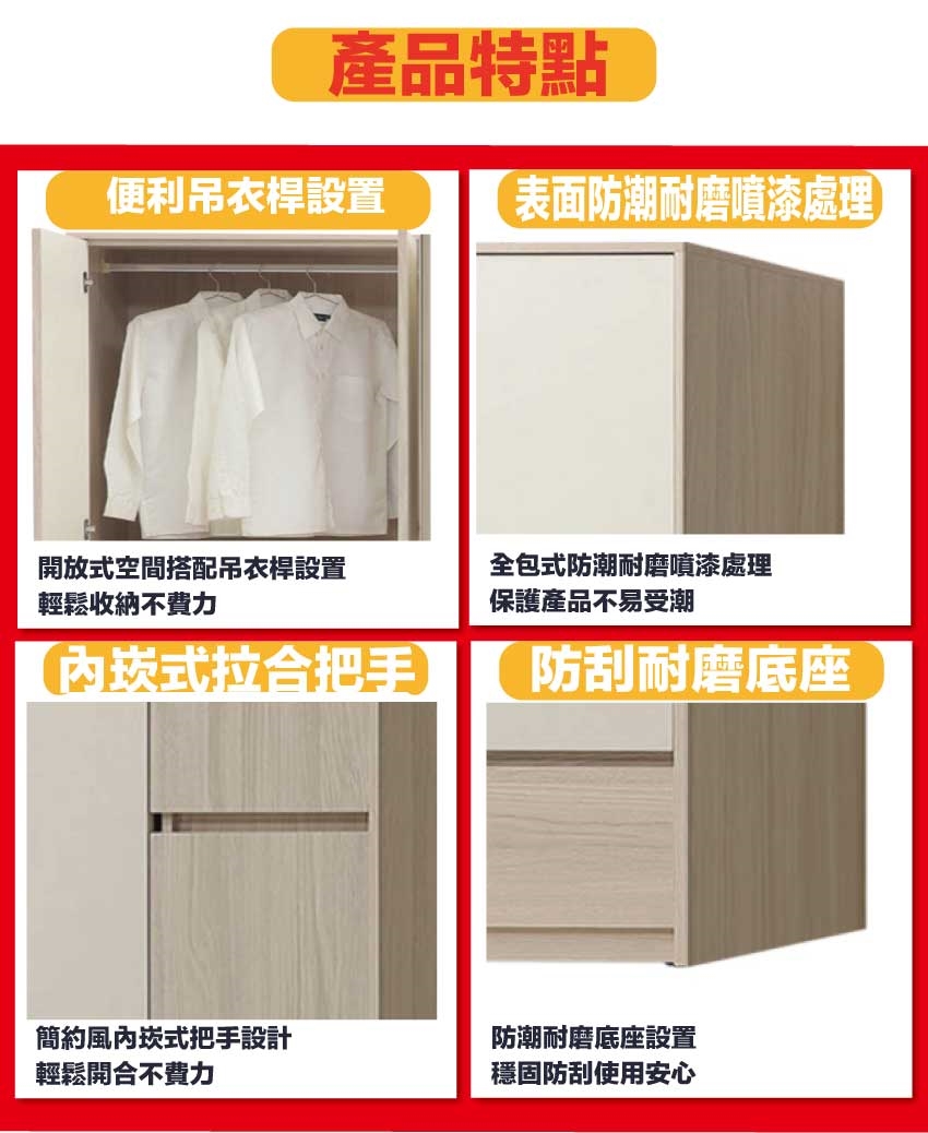 材質:防蛀木心板+防潮耐磨底座(可調高低水平)+防夾手緩衝門片五金 -
