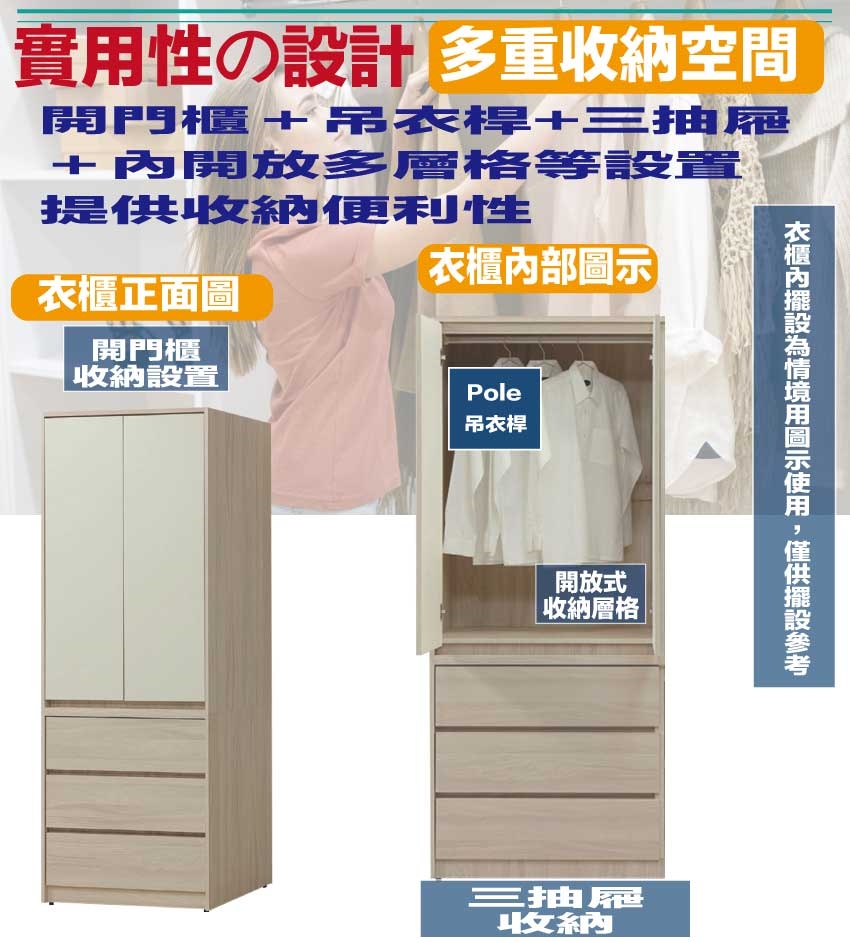 採用開門櫃+吊衣桿+三抽屜+內開放層格等收納空間設計