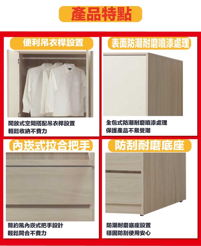 材質:防蛀木心板+防潮耐磨底座(可調高低水平)+防夾手緩衝門片五金 -