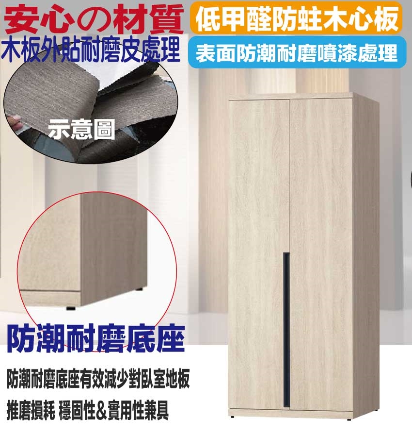 ★偏遠地區需額外加收運費,下標請先問與答詢問★ ★下訂前注意 由於商品流動較快,下訂前請先詢問是否有貨在下訂喔~★ 【綠家居】摩泰2.7尺二門內單抽衣櫃 淺橡木紋色系+現代簡約風格+安心材質製造,使用放心+搭配居家更便利,整體採用防蛀木心板+防潮耐磨底座(可調高低水平)+防夾手緩衝門片五金等安心材質製造搭配外層採用優莉坦耐磨全包式噴漆處理 ,採用開門櫃+吊衣桿+單抽屜+內開放層格等收納空間設計,全由專人配送到家,專業安心服務,替你省下更多時間!