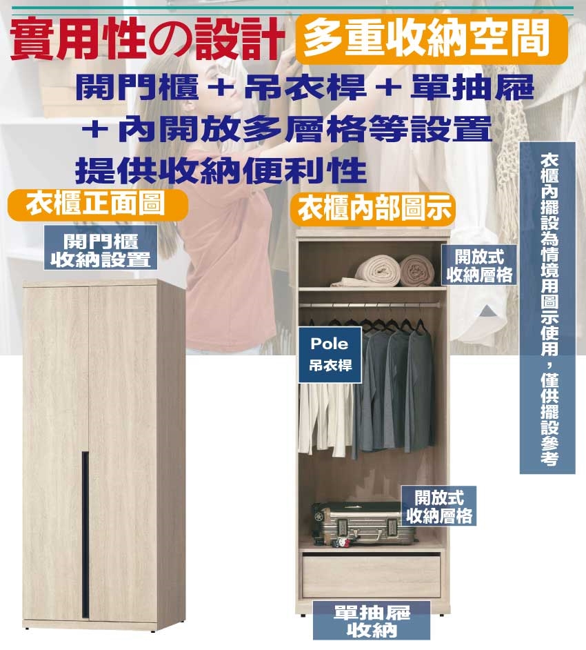 採用開門櫃+吊衣桿+單抽屜+內開放層格等收納空間設計