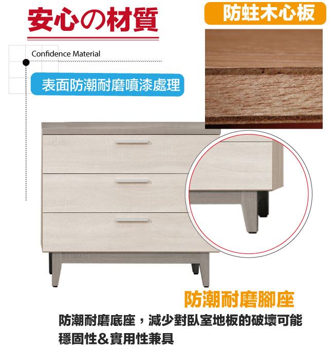 材質 | ◆產品名稱:【綠家居】芙娜雙色2.7尺三抽斗櫃 尺寸:(寬)80.4(深)40.3(高)72.1公分 ◆材質: 材質:防蛀木心板+防潮耐磨腳座+五金滑軌結構 噴漆:防潮耐磨噴漆處理